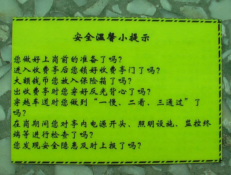 該站首先召開了專題會(huì),精心組織,周密安排,營(yíng)造濃厚的“安全生產(chǎn)月”活動(dòng)氛圍;其次是形式多樣,務(wù)求實(shí)效。利用安全知識(shí)、安全提示卡、安全知識(shí)小測(cè)試等形式,普及安全生產(chǎn)常識(shí)。三是做好安全生產(chǎn)隱患自查自改工作。站安全領(lǐng)導(dǎo)小組集中對(duì)站內(nèi)的收費(fèi)、監(jiān)控、機(jī)電設(shè)施等重點(diǎn)區(qū)域進(jìn)行了安全排查,針對(duì)發(fā)現(xiàn)的問題進(jìn)行了整改。四是深化班組長(zhǎng)在崗期間安全生產(chǎn)負(fù)責(zé)制。實(shí)施班組安全檢查制,每天由班組負(fù)責(zé)上崗期間收費(fèi)亭、收費(fèi)廣場(chǎng)的安全檢查,填寫《班組安全檢查記錄表》,做到了安全工作與業(yè)務(wù)工作的有效結(jié)合。( 110國(guó)道沙城收費(fèi)站 王輝)