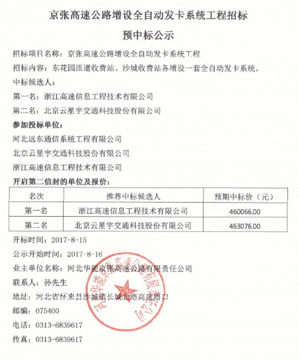 京張高速公路增設(shè)全自動發(fā)卡系統(tǒng)工程招標預(yù)中標公示