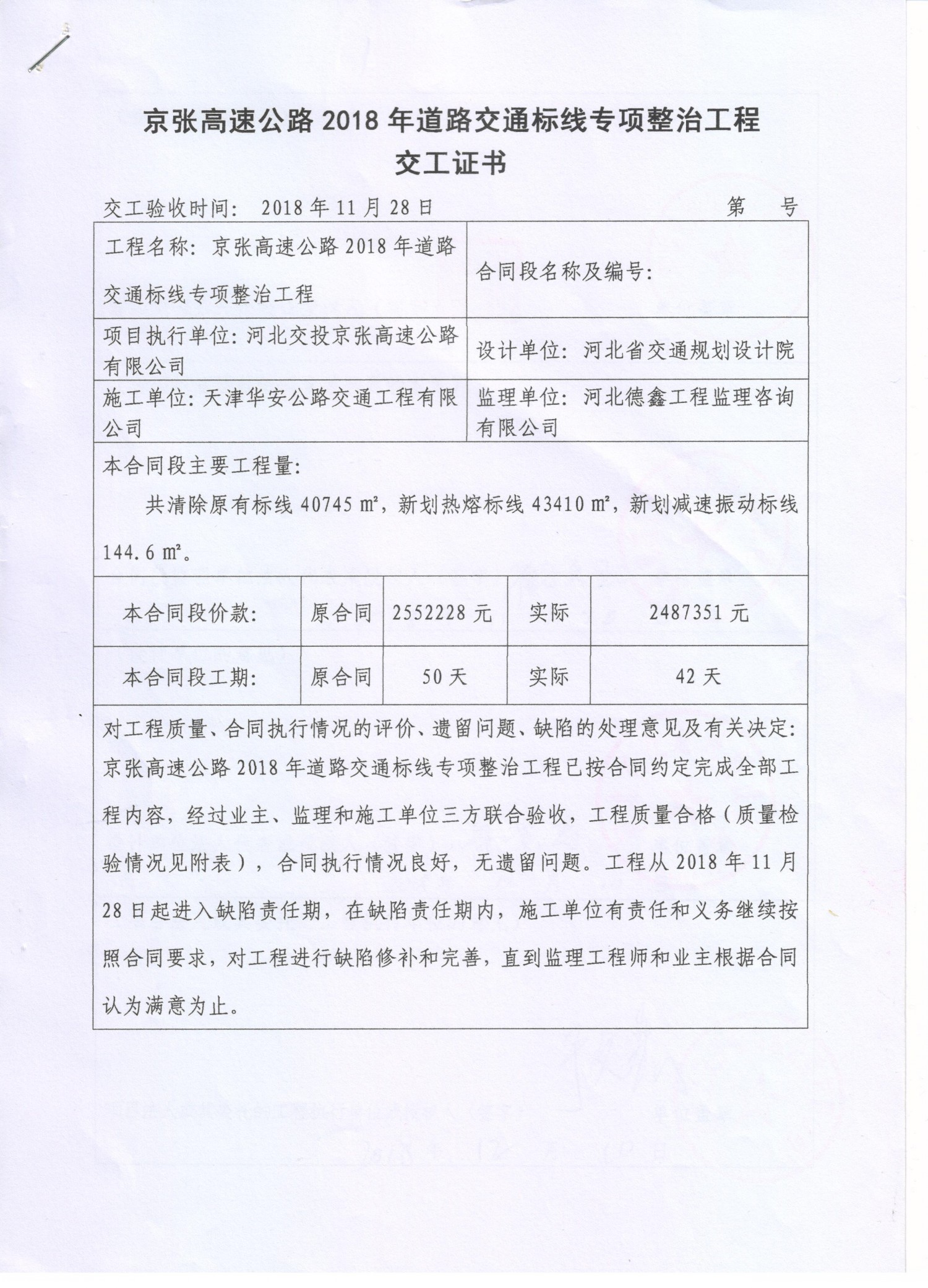 京張高速公路2018年道路交通標線專項整治工程交工證書